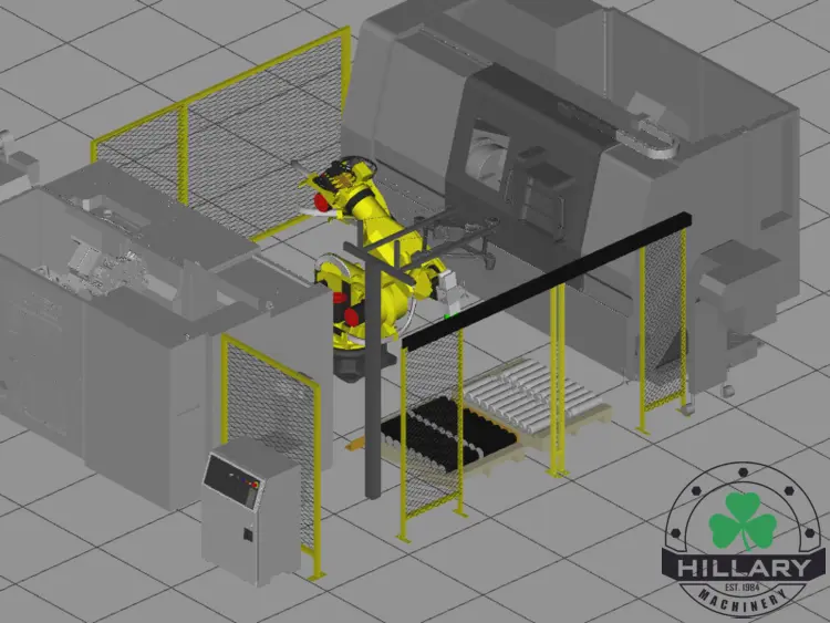 Exactly how we describe it......2 new or pre-existing CNC machines being tended to by 1 robot; with up to a 595 lb. max payload. For multi-op workpieces or 2 separate (or different) workpieces, this cell can be adapted with a 3D vision guidance system for loose and/or heavy workpieces. Eliminate your gib crane and the time it takes your operator to load a part using a jib crane. Add an optional flipping station for OP20, or secondary operations like a deburring station.