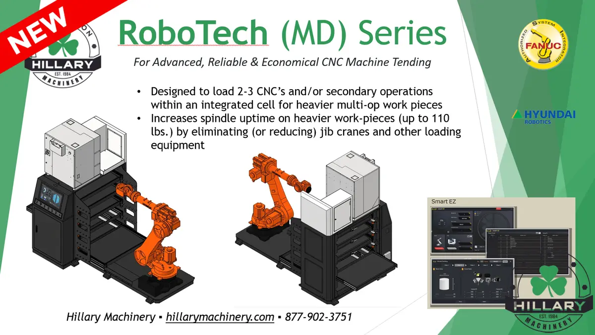 Designed to load 2-3 CNC’s and/or secondary operations within an integrated cell for heavier multi-op work pieces. Increases spindle uptime on heavier work-pieces (up to 110 lbs.) by eliminating (or reducing) jib cranes and other loading equipment