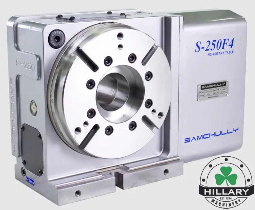 New SAMCHULLY S-250 Rotary Table, featuring a 9.45" table diameter and 2.76" max hole diameter. Ideal for precise machining. Ready to enhance your operations with advanced NC indexer capabilities.