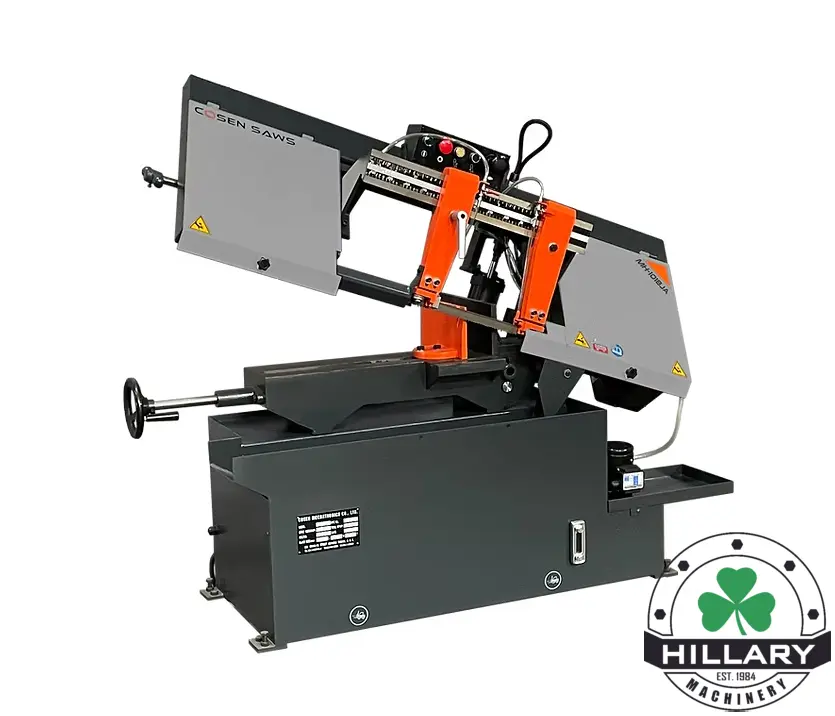 COSEN MH-1018JA Horizontal Band Saw, new condition. Features a cutting capacity of 10" round and 9" x 16.5" rectangle. Equipped with a 2 hp motor, 138" blade length, 1" width, and manual operation. Ideal for precise and efficient cuts.