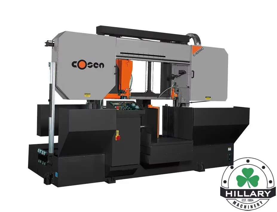 COSEN C-620NC, new automatic horizontal dual column band saw, offers 24.4" round and 24.4" x 30" rectangular cutting capacity, powered by 10 hp. Features a 283" blade, 0.063" thick, and 2" wide. Ideal for precise, high-capacity cuts.