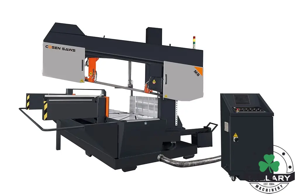COSEN M8 Miter Saw offers precision with a powerful 10 hp motor, cutting rounds of 19.6" and rectangles up to 19.6" x 31.4". Featuring a 300" blade length and 0.063" thickness, it's designed for efficient automatic operation. Condition: new.
